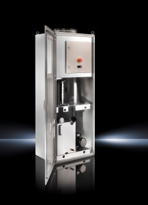With extensive option packages, customer requirements can now be met in an even more flexible way. For example, a 24V DC control voltage meets the demands of the automotive industry. The use of a water-cooled condenser with a water flow rate regulator improves the energy efficiency of the refrigeration system and avoids the thermal load of the ambient air. If the temperature of the coolant also has to be precisely controlled with machine-tool systems, Rittal offers a hot gas bypass control as an additional option package. A selection can be made between pumps with 4 and 6 bar, flow monitor, water level monitoring, non-ferrous piping, media bypass, ambient temperature control, pre-mounted base and standard RAL colours for the outside of the enclosure and its parts. Other options include systems for ambient temperatures to -5^0C or -20^0C with variable speed condenser fans and electrical components in UL versions.