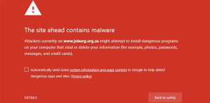 The following message appears when clicking through to the site: "The site ahead contains malware. Attackers currently on www.joburg.org.za might attempt to install dangerous programs on your computer that steal or delete your information (for example, photos, passwords, messages and credit cards)."