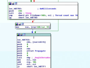 In the sample analysed, the number of internal propagation threads was capped at ten (see image below). After the initial ten threads are spawned, the malware will sleep until one of those threads terminates before attempting to spread to another address.
