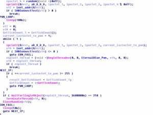 Attempts to propagate externally occur concurrently with the internal propagation attempts, but in a slightly different manner. For the purposes of spreading to IP addresses external to the organisation, the malware creates 128 threads, one-by-one, each two seconds apart. These threads employ an IP generation function using srand() - seeded with the current thread ID, time, and tick count - and random() to generate a /24 subnet to scan (see image below). If an open SMB port is found, a new thread is started calling the same EternalBlue /DoublePulsar exploit function as used internally but with a sixty minute timeout.
